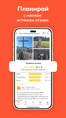 Мечтаете за следващото си приключение, независимо дали го планирате месеци напред или търсите вдъхновение в последния момент? GetYourGuide е вашият портал към свят от незабравими изживявания. Ние трансформираме всяко пътуване в приказка, предлагайки лесен достъп до хиляди туристически обиколки, еднодневни екскурзии и уникални атракции. От потапяне в местната култура, през кулинарни приключения и вълнуващи спортни дейности, до срещи с дивата природа – изберете своето идеално занимание и превърнете всеки миг в ценен спомен.