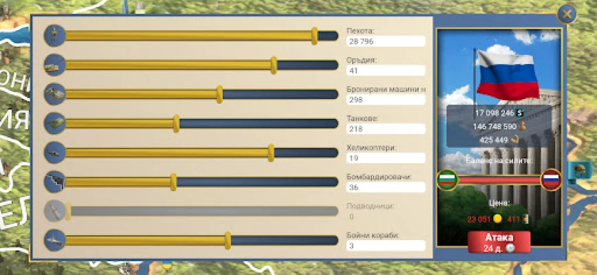 На международната сцена предизвикателствата са също толкова многобройни. Развийте мощна армия и флот, усъвършенствайте военните технологии и използвайте шпионаж, за да утвърдите влиянието си. Сключвайте съюзи, търговски договори и отбранителни пактове с други държави, участвайте в гласувания в ООН и налагайте санкции, за да оформяте геополитическия пейзаж. Не забравяйте да се справите и с неочаквани кризи – от природни бедствия и епидемии до терористични атаки и икономически спадове – показвайки, че истинският лидер винаги е готов да защитава и подкрепя своя народ.