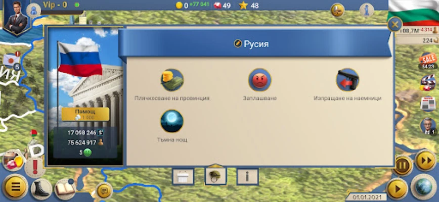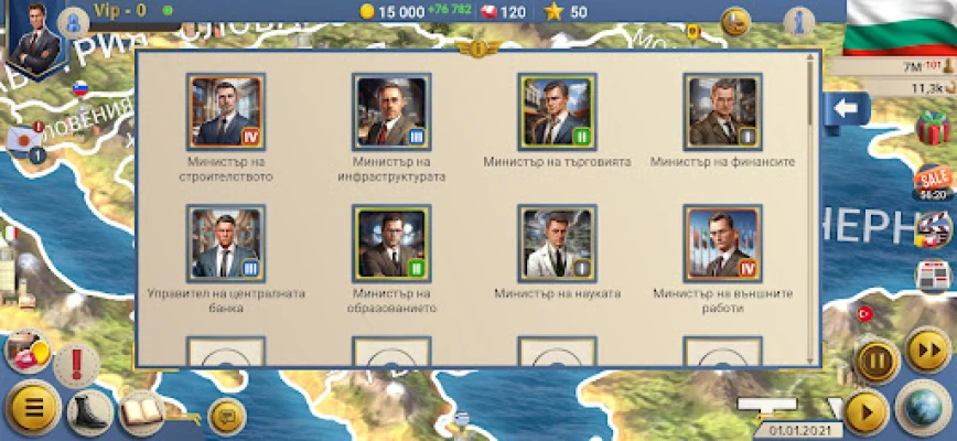 На международната сцена предизвикателствата са също толкова многобройни. Развийте мощна армия и флот, усъвършенствайте военните технологии и използвайте шпионаж, за да утвърдите влиянието си. Сключвайте съюзи, търговски договори и отбранителни пактове с други държави, участвайте в гласувания в ООН и налагайте санкции, за да оформяте геополитическия пейзаж. Не забравяйте да се справите и с неочаквани кризи – от природни бедствия и епидемии до терористични атаки и икономически спадове – показвайки, че истинският лидер винаги е готов да защитава и подкрепя своя народ.